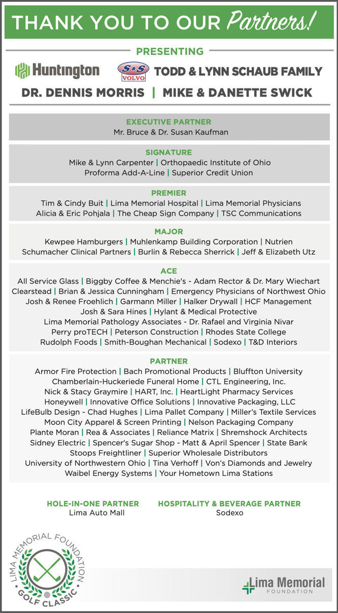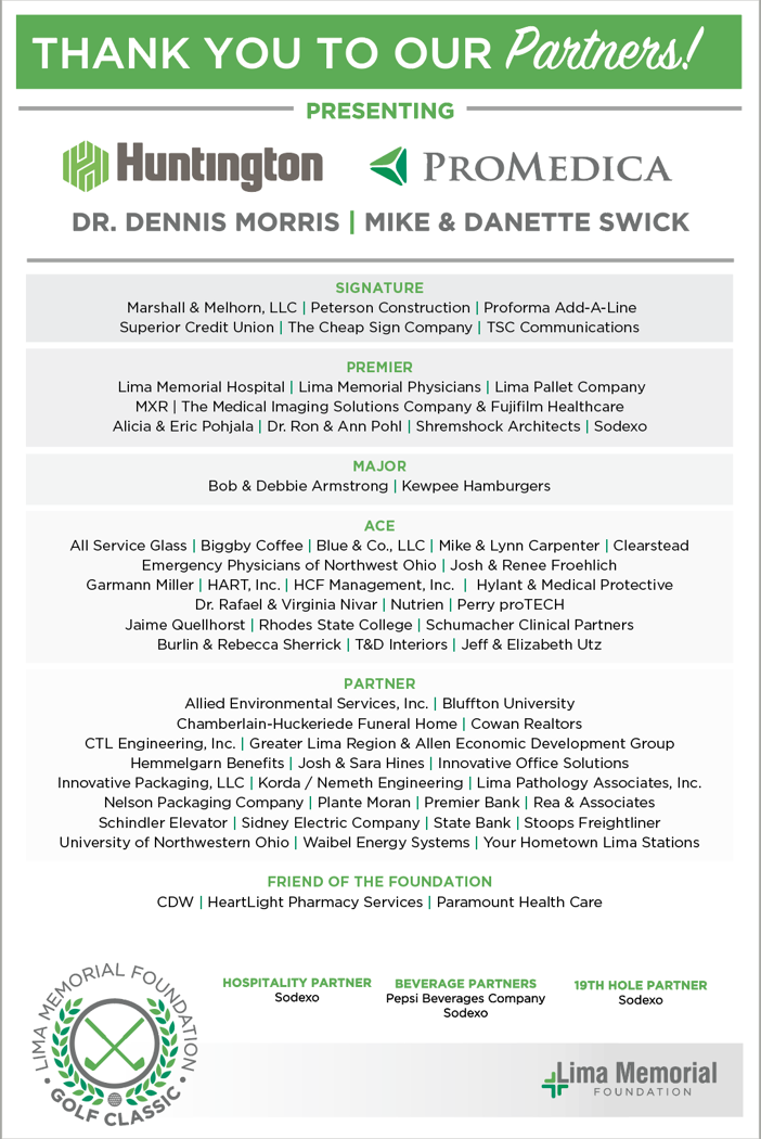 If you are interested in participating in the 2026 Lima Memorial Golf Classic, contact the Lima Memorial Foundation at lmfoundation@limamemorial.org or 419-226-5087.