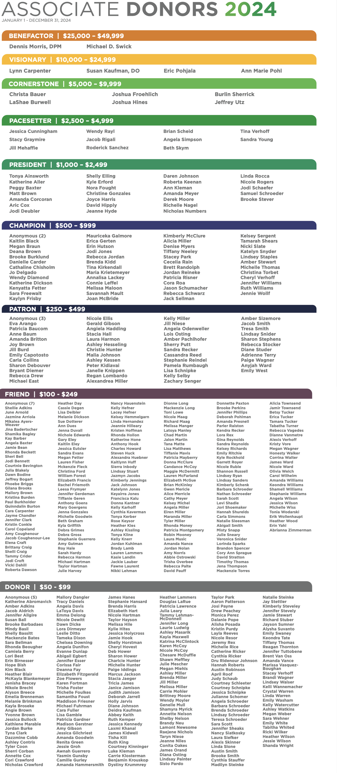 Dr. Fadi Abbass | Dr. V. Simon Abraham | All Service Glass | Dr. Paul Anike | Dr. Vankat & Sandhya Battula | Biggby Coffee & Menchie's - Adam Rector & Dr. Mary Wiechart | Brundage Group | Clearstead | Brian & Jessica Cunningham | Emergency Physicians of Northwest Ohio | Josh & Renee Froehlich | Garmann Miller | Halker Drywall | HCF Management | Josh & Sara Hines | Hylant & Medical Protective | Lima Memorial Pathology Associates - Dr. Rafael & Virginia Nivar | Perry proTECH | Peterson Construction | ProMedica | Rhodes State College | Rudolph Foods | Ken Rumbaugh, Inc. | Smith-Boughan Mechanical | Sodexo | T&D Interiors | Dr. Mwafa Turjman & Mrs. Rafif Safi | Dr. Darlene Weyer