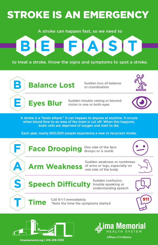 If you are experiencing signs of a stroke, including numbness, confusion, severe headaches, one-sided arm or leg weakness, slurred speech or have trouble walking or seeing, call 911 immediately. Time is brain.