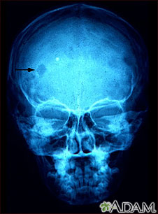 This x-ray of the skull shows an eosinophilic granuloma (a lesion made-up of a type of white blood cell). This condition can range from a single eosinophilic granuloma to massive infiltration of skin, bone, and body organs.