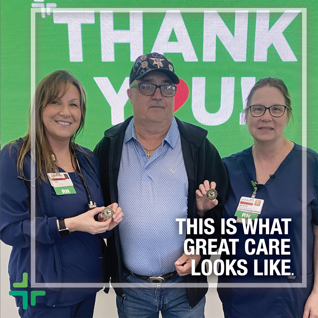 As a veteran, Gary shared a personal story from his time overseas. After suffering a serious injury, a nurse had taken exceptional care of him, but he never had the chance to thank her before she was reassigned. He carried that regret with him for years. When he began recovering from his recent experience at Lima Memorial, he promised himself he would not miss the chance again. True to his word, he returned in person to thank Amy and Jen for saving his life, presenting each of them with a special military coin in heartfelt appreciation for their care.
