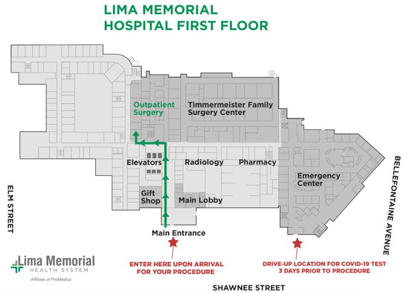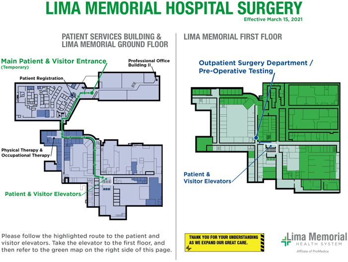 - Using the map below, follow the green arrow path to the outpatient surgery pre-operative testing window.